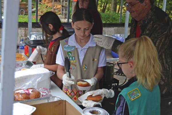 - Girls Scouts, from left, Athena Riach, Autumn Ryan and Aleia Christiano help serve veterans at the fourth annual veterans picnic at Pine Tree Rifle Club in Gloversville on Saturday. (The Leader-Herald/Eric Retzlaff)