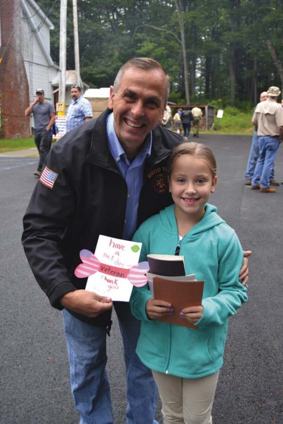 - McKenna Dow of Girl Scout Troop 2142 of Gloversville hands a thank you card for veterans to state Assemblyman Robert Smullen, coordinator of the fourth annual veterans picnic at Pine Tree Rifle Club in Gloversville on Saturday. (The Leader-Herald/Eric Retzlaff)